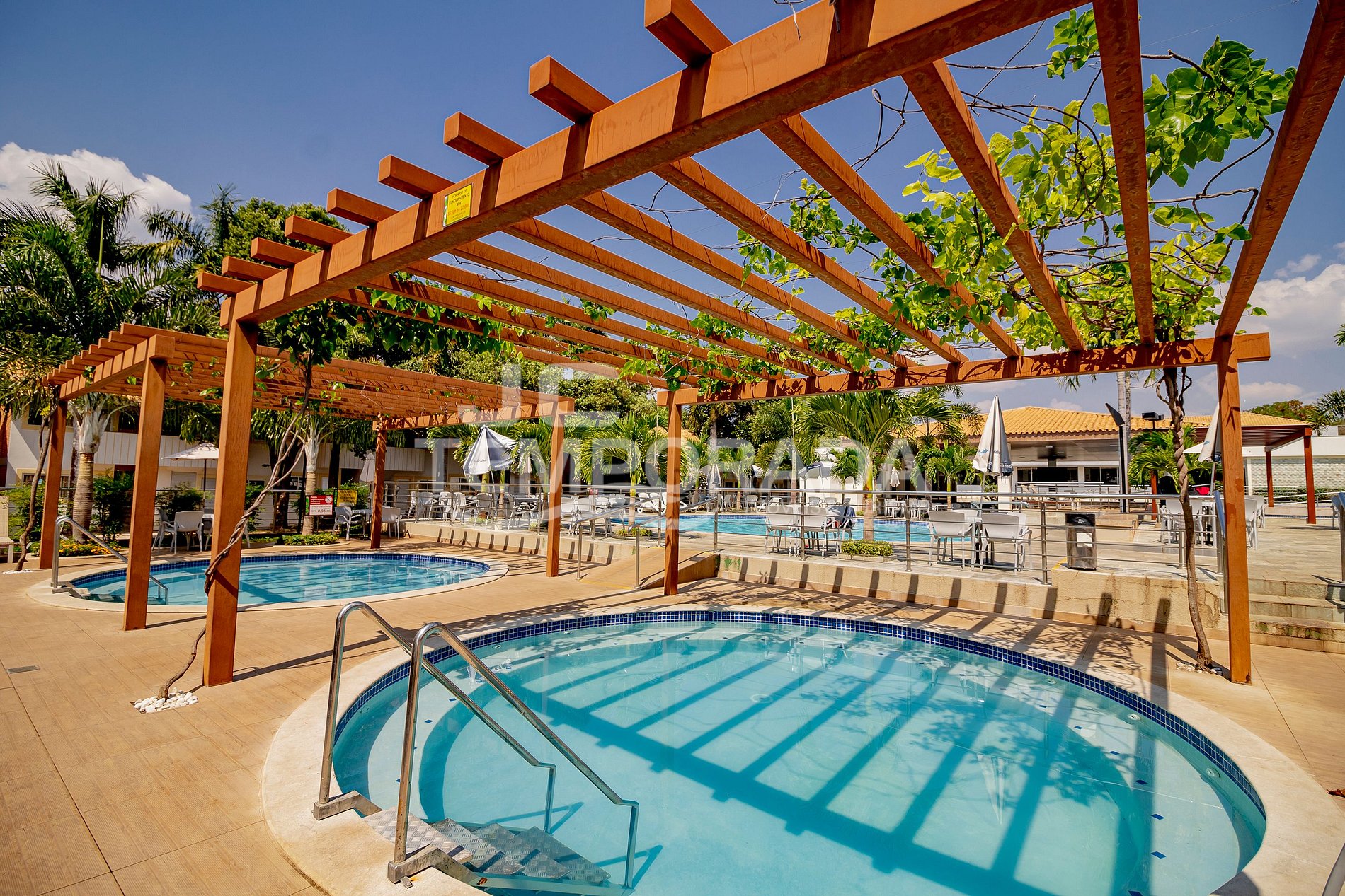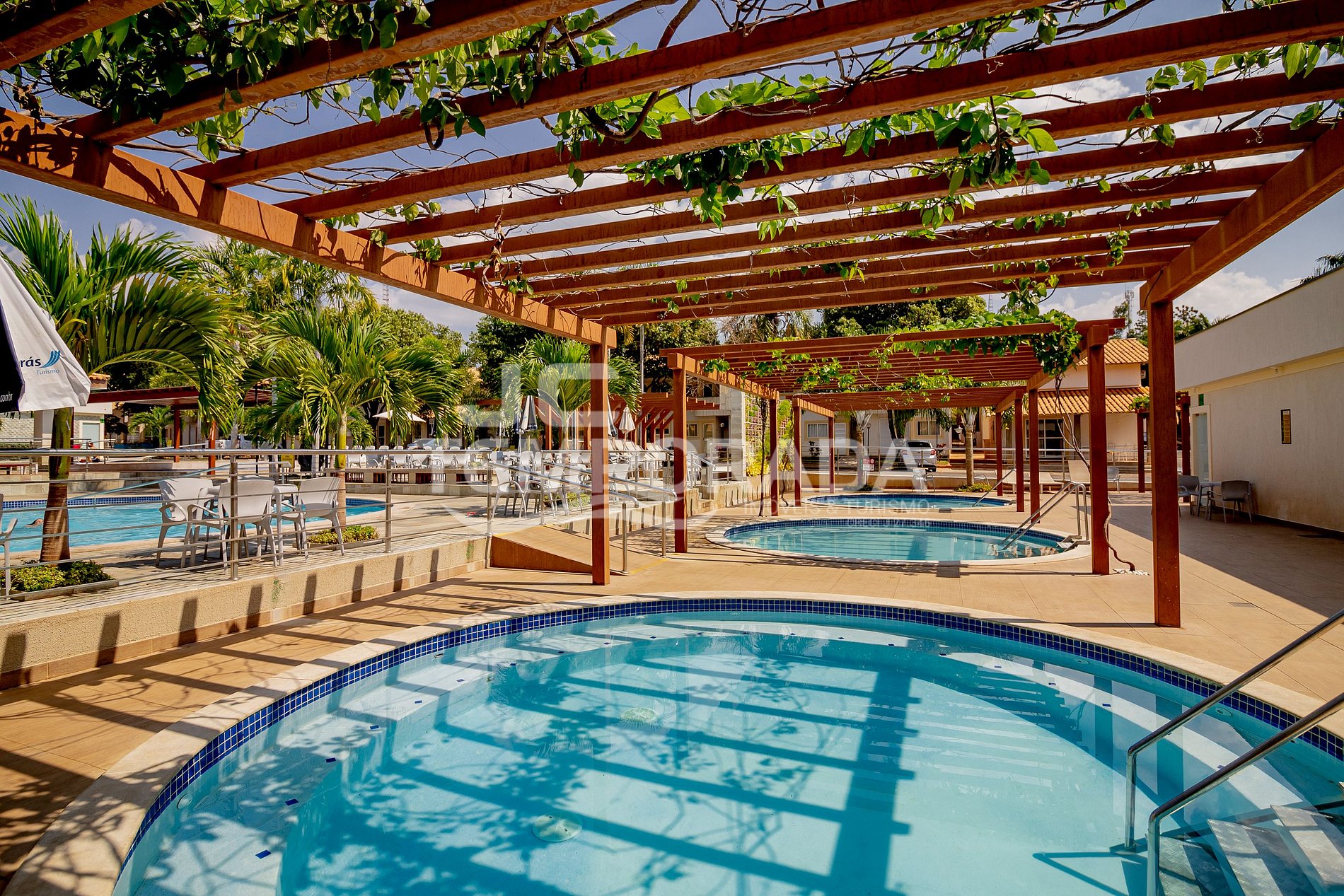 05 piscinas, sendo quatro quentes e uma fria (quatro piscinas adultas e uma infantil)