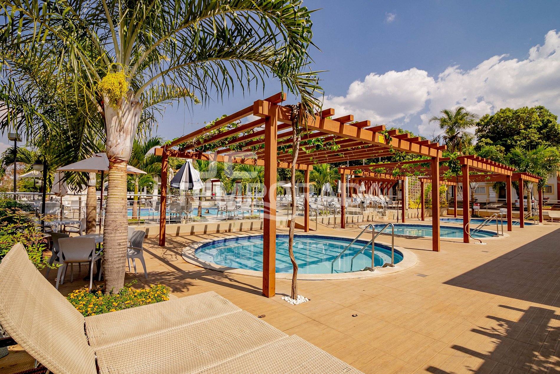 05 piscinas, sendo quatro quentes e uma fria (quatro piscinas adultas e uma infantil)